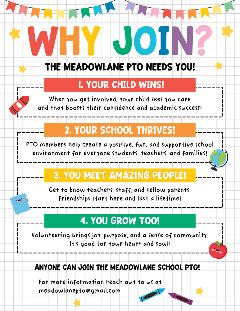 The success of PTO depends on parent and teacher participation. All staff and parents of children attending Meadowlane are automatically members with voting rights.